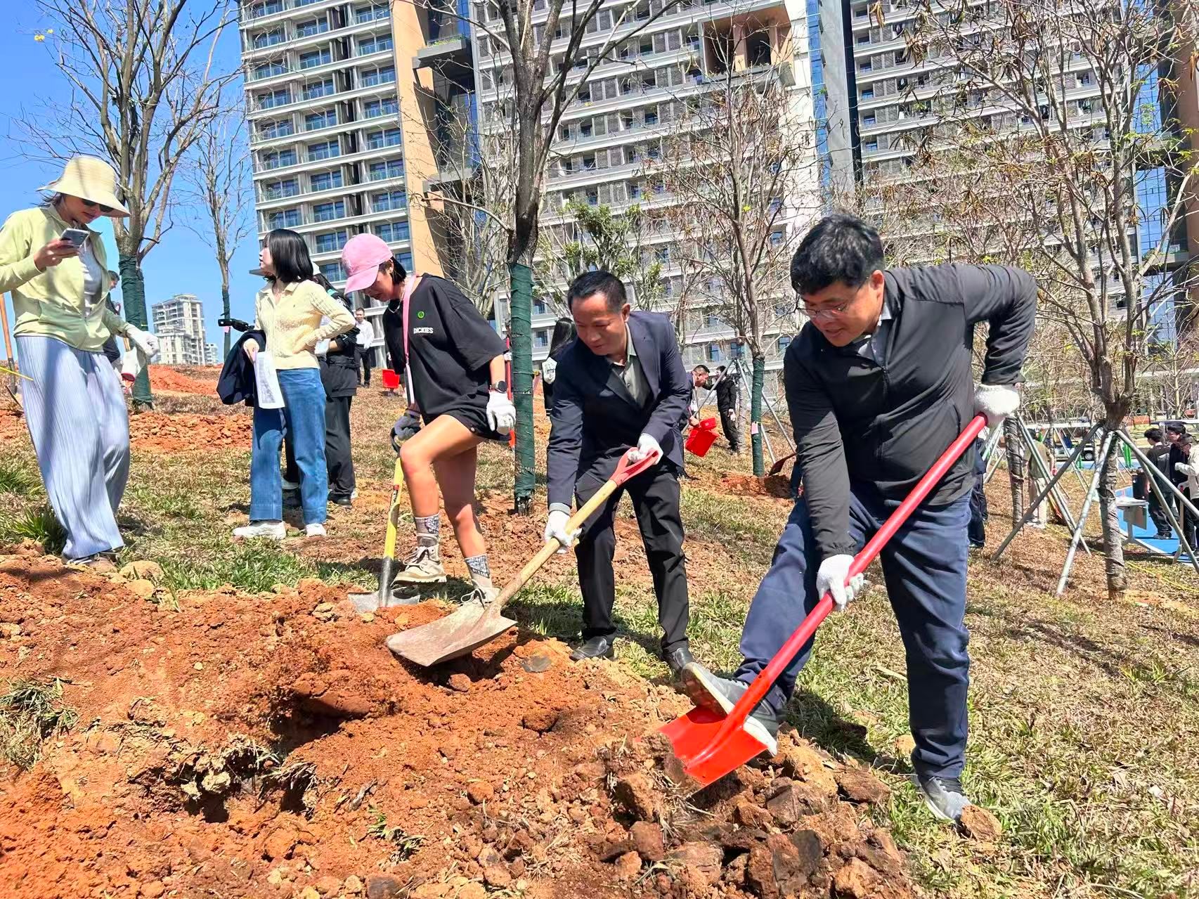 随后,30名师生共同参加了植树活动,通过挥锹培土、提水浇灌等环节,亲身体验植树过程,在劳动中体悟绿色生命的成长与生态保护的责任,将课堂所学的理论认知深化为具体的实践体验。