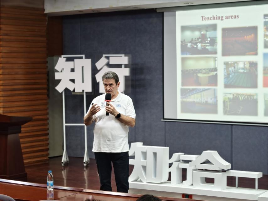 讲堂中,Laparidis教授结合运动营养学研究与教学经验,系统介绍了地中海饮食的起源、核心构成及健康价值,重点解析了全谷物、蔬果、橄榄油、深海鱼等食材的营养特点,及其在维护心血管健康、降低慢性病风险、提升身体机能方面的科学依据。
